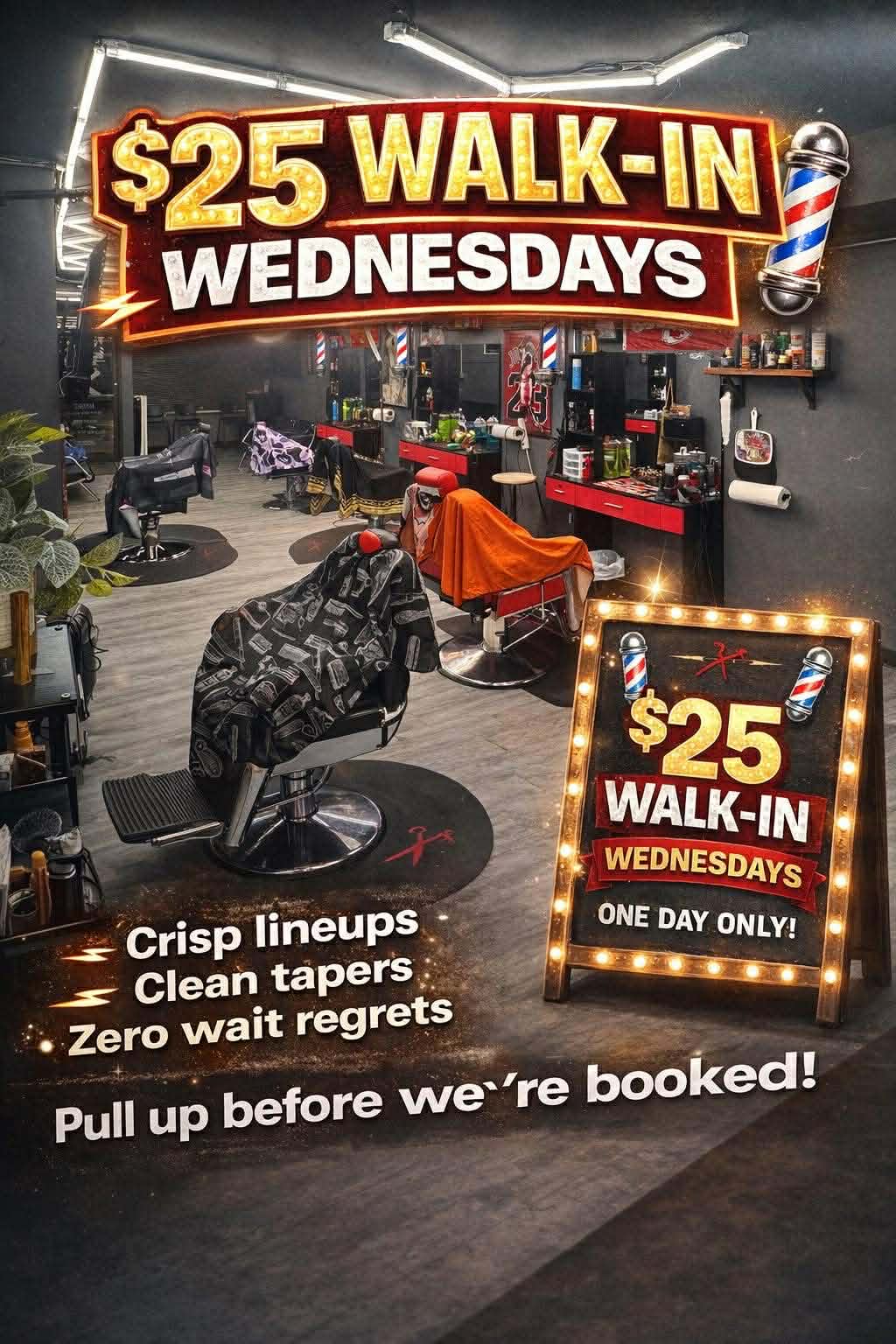 Come in for a crispy lineup, fresh fade or a clean taper at your convenience on Wednesdays for only $25. Walk-ins are welcome but you can also book your slot below or call us at to ensure you will get a cut.
